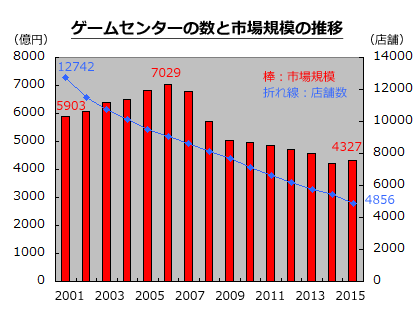 日本游戏店、街机厅的发展境遇其实和便利店极为相似,灵活多变、贴近生活,它同样是民众消费习惯转变过程中的受益者。从 ToukeiData 提供的数据来看,日本游戏厅和街机厅(包括百货商店里的门店和兼营门店)的数量在 2001 年~2015 年之间从 12742 家滑落到了 4856 家。但有趣的是,市场总值的下滑却较为缓和,而且在 2013 年之后还略有回暖的迹象。这意味着商业街形式的集中店面确实遭到了不小冲击,但贴近民众的社区化门店却在洪流中站住了脚。