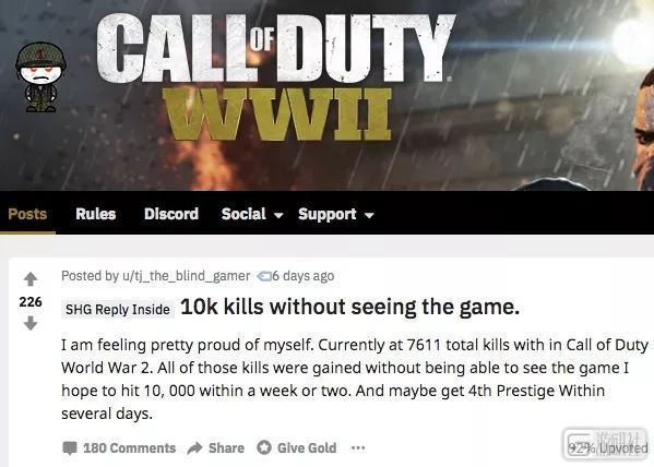 不看屏幕就取得 1 万次击杀——我感到非常自豪,虽然我的眼睛看不见,但是目前我已经在《使命召唤:二战》里击杀了 7611 个人,我希望在接下来的一两周内我能把这个纪录提高到 1 万次。我还没有听说过哪一个盲人可以完成这个任务。