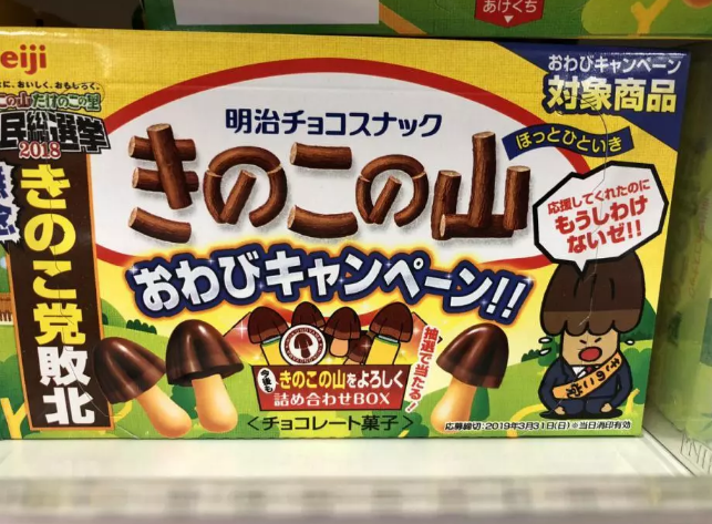 此外的各式官方活动也是年年有,最近比较热闹的就是这次 2018 年度「蘑菇山 VS 竹笋村」国民总选举。两派各推出代表蘑和代表笋注册推特账号,煞有其事进行拉票。想要支持自己阵营的人,只能购买相应的零食才能进行投票,单作为营销活动就大获成功。