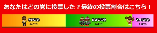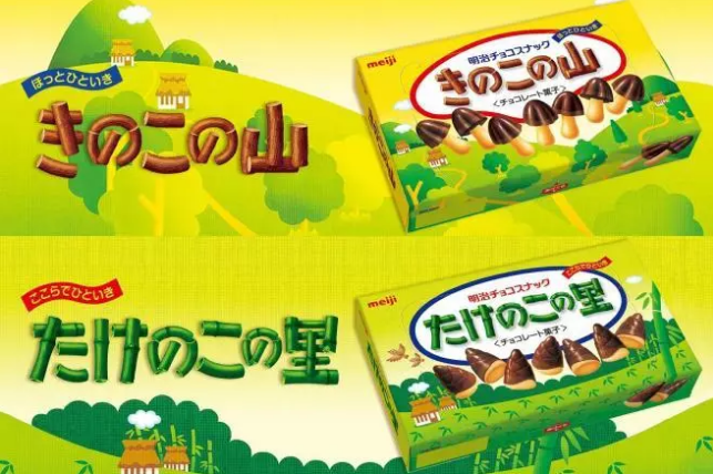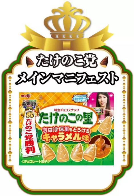 可能很多小零食的爱好者也知道,上述的「蘑菇党」和「竹笋党」分别是零食蘑菇山(きのこの山)和零食竹笋村(たけのこの里)的簇拥者,这次的所谓「选举」也是这两种零食之间的一次人气投票对决。