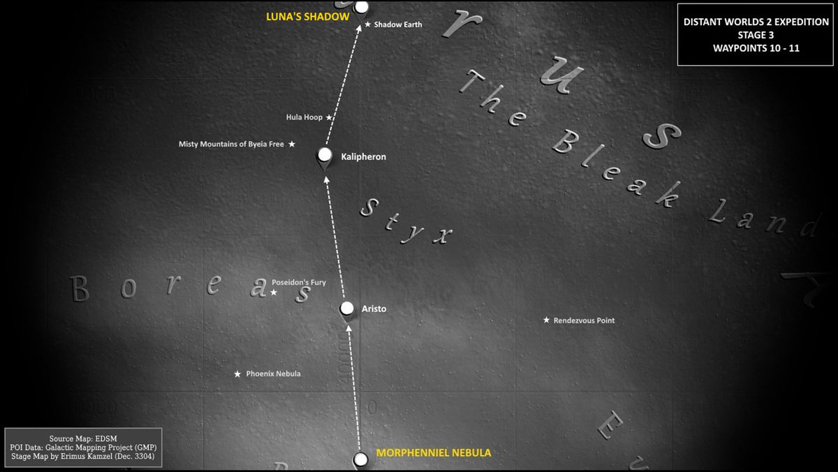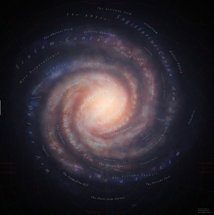 Erimus 号召远星 2 远征团队里的近 14000 个玩家去精密探查路标 10 和 路标11 之间那片被叫做远日点(The Aphelion)的区域。那里幅员 14000 光年,并且鲜有玩家涉足。在来月影星之前,我一直在它下方的某一片叫做冥河(Styx)的区域绘制地图。那里位于银道面(天球上沿着银河画出的一个大圆称为银道,银道所在的主平面称为银道面)之下,与银道面的垂直距离为 1000 光年。