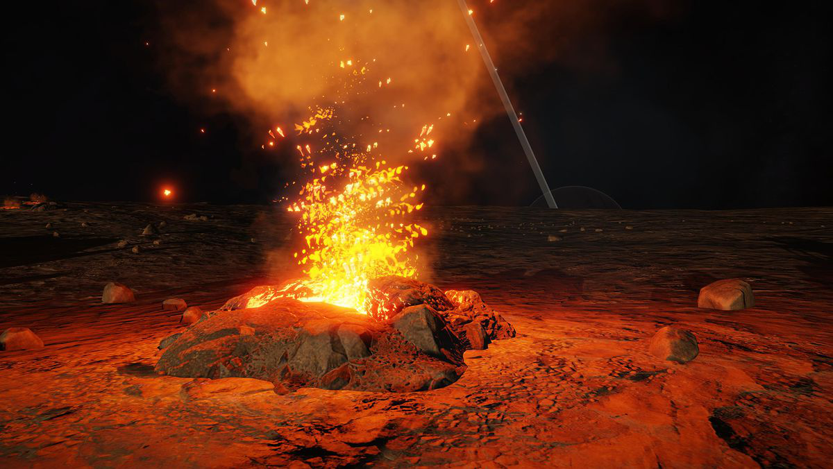 降落在说书人之火这片区域后,你能看见代表明天的日光浮现在几公里外的地平线上,但对于这里的「篝火」来说,「明天」永远不会到来。我想,这里会成为其他玩家在旅程中一个美丽的歇脚点。他们可以在这里降落,走出飞船,围着篝火分享自己的故事。