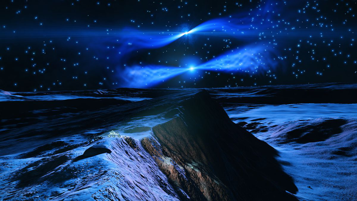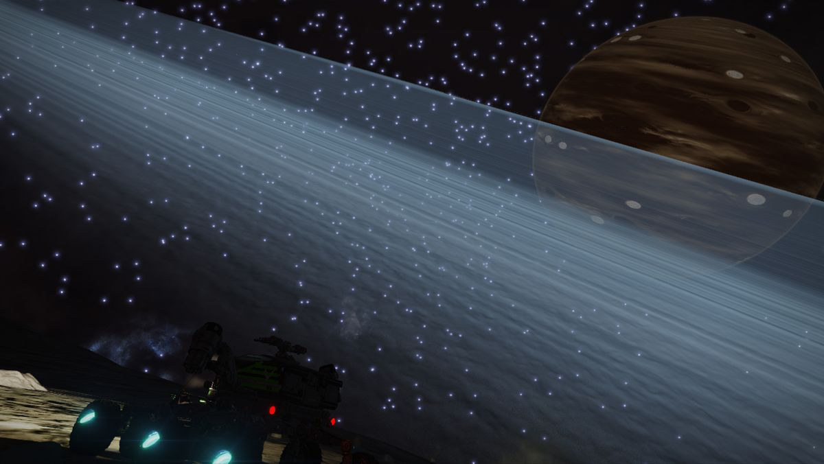我曾路过一个仿如生锈线网的亮色星云,曾掠过滚烫的白矮星,差点在一瞬间内烧掉我敏捷的太空船。我也曾飞入中子星那高速旋转的巨大燃油束中收集燃油补充燃料,也曾坐着六轮月球车攀登高耸的冰山,一步踏错就可能万劫不复。我还曾俯冲入一条狭窄的峡谷,两侧高耸的崖壁超过 10 公里之深,曾飞到一对双子星中间,感受两颗星球之间彼此纠缠不清的引力。