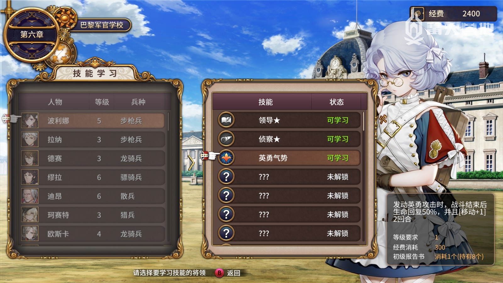 比起「火纹」的难度,《圣女战旗》应该说还算手下留情。游戏中虽然存在武器耐久,但在下一关就会恢复满值;敌我双方虽然属性接近,但好在过关之后阵亡的角色也能复活。通过初期关卡,解锁「技能学习」功能之后,各个角色的特点会逐渐体现,善加利用可以明显提升胜率。学习技能需要的耗材是「报告书」与经费(钱),鉴于装备道具通常比较贵,我的建议是初期优先把银子花在常用角色的技能上。