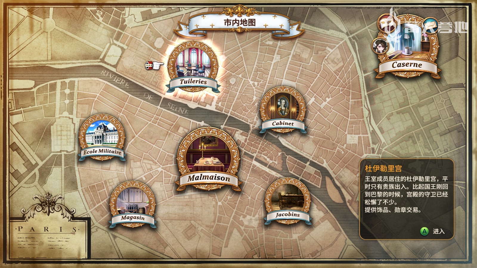 比如每次通关后,都会响起法国国歌《马赛曲》作背景音乐,屏幕上的文字也是法语「la victoire est à nous」—— 胜利属于我们。刚刚进入属于波利娜自己的房间,会看到巴黎市区地图挂在墙上,非战斗场景的地点选择也是在这张真实还原了地理位置的地图,我们可以前往杜伊勒里宫(凯瑟琳王后在卢浮宫旁修建的宫殿),与王室成员高谈阔论 。