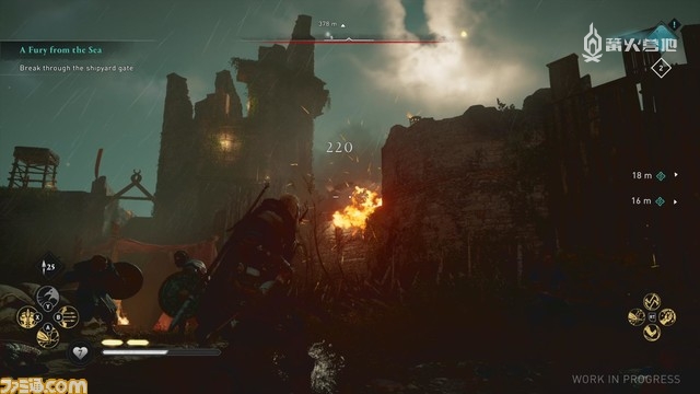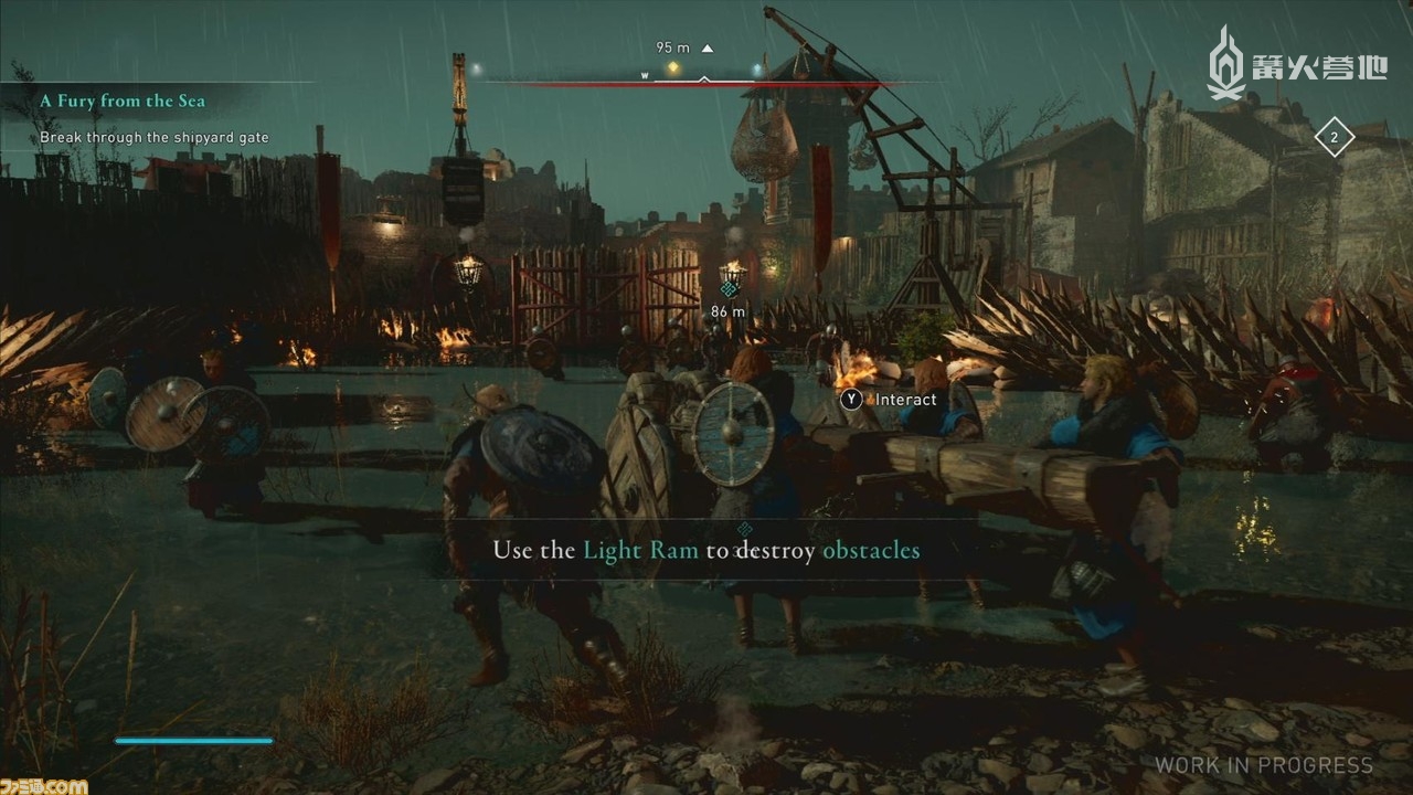 「攻城战」系统是本作最具特色的系统之一。该玩法中,玩家需要和同伴们一起从正面对敌人发起一次大规模的战役,有点类似《奥德赛》中的征服战,但攻城战将分为以下几个阶段进行:主角一行搭乘长船(袭击海岸时所使用的维京船)攻入敌人的据点→清理掉区域内的敌人后,用攻城槌破坏城门→打倒敌人首领,压制据点。玩家可以借此享受到逐步支配敌人领地的攻城乐趣。