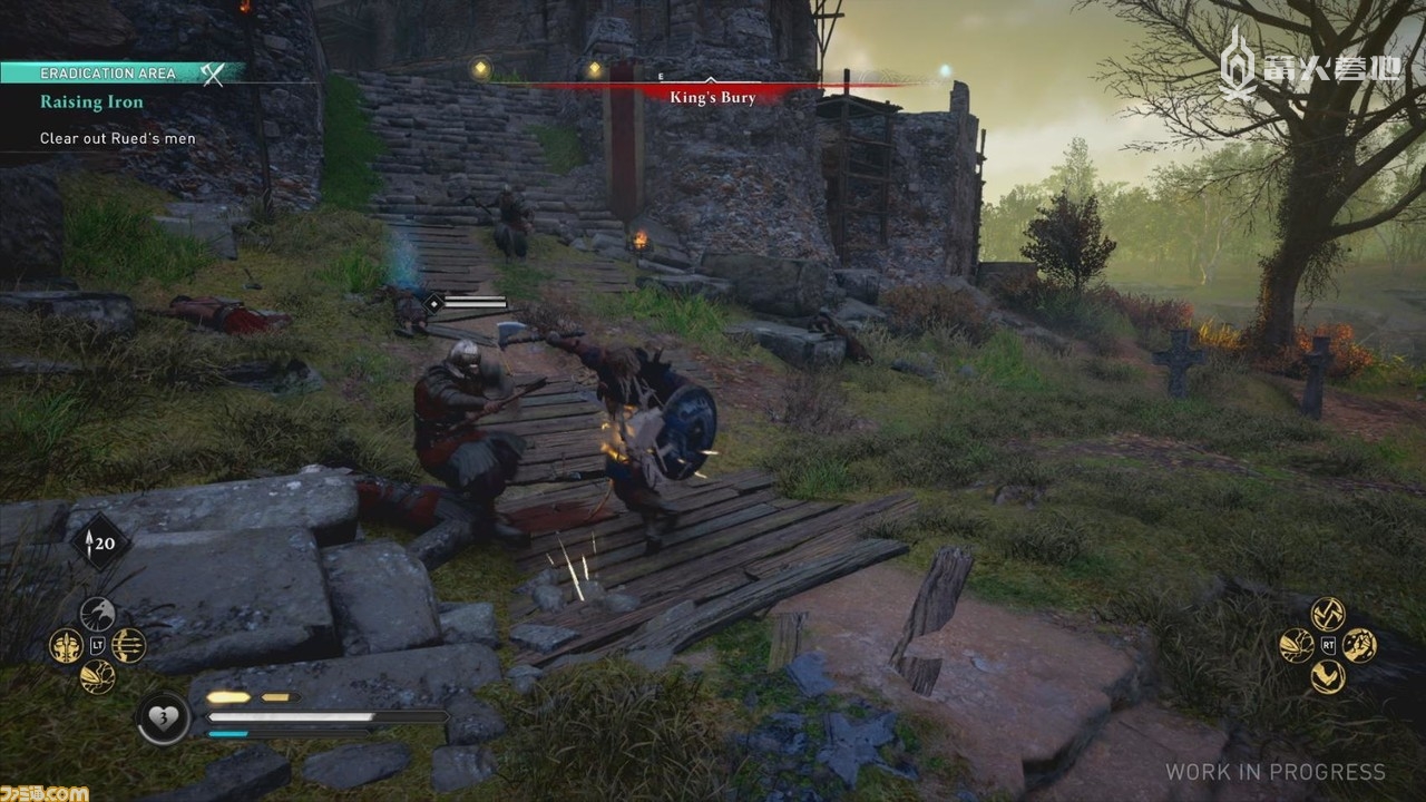 本作基本沿袭了前作《刺客信条:奥德赛》(以下简称《奥德赛》)的战斗系统。不仅动作性极强,拳打脚踢的战斗场景也非常有趣。系列玩家熟悉的使用鸟类(本作中为乌鸦)在上空盘旋侦查的鹰眼系统依然得到了保留。那么本作与前作相比究竟有何不同呢?接下来笔者将一一为大家介绍我在本次试玩中发现的主要区别。