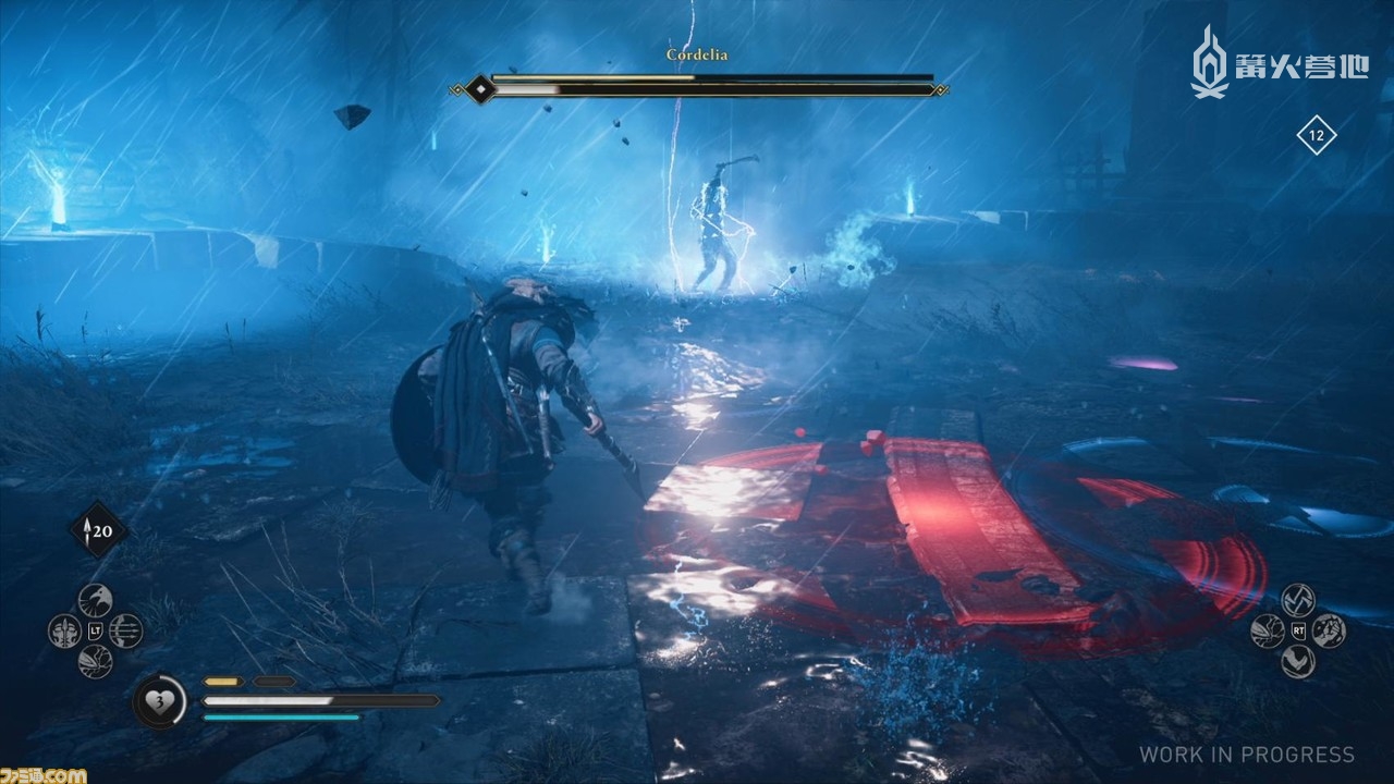 考狄利娅能召唤无数的落雷降临在主角的周围。落雷地点会提前用红色的警告范围标示出来,在移动时需要时刻注意脚下的情况
