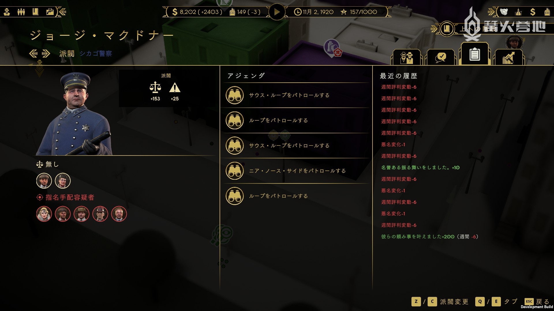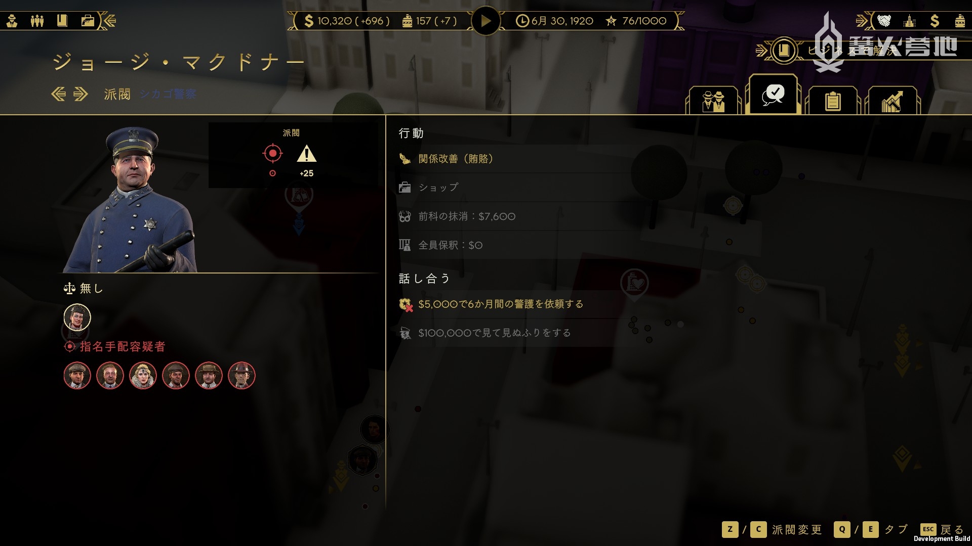 与对手同样的,还需要考虑与芝加哥警察的关系。与警察的关系恶化后,店铺被搜捕(强制搜查)的几率会大幅提高,在城内的战斗也更容易受到攻击。相反,与警察建立良好的关系,可以委托店铺的防卫,或是倒卖部分装备。与警察的关系较差时,可以通过告发其他黑帮、或是贿赂来改善关系。
