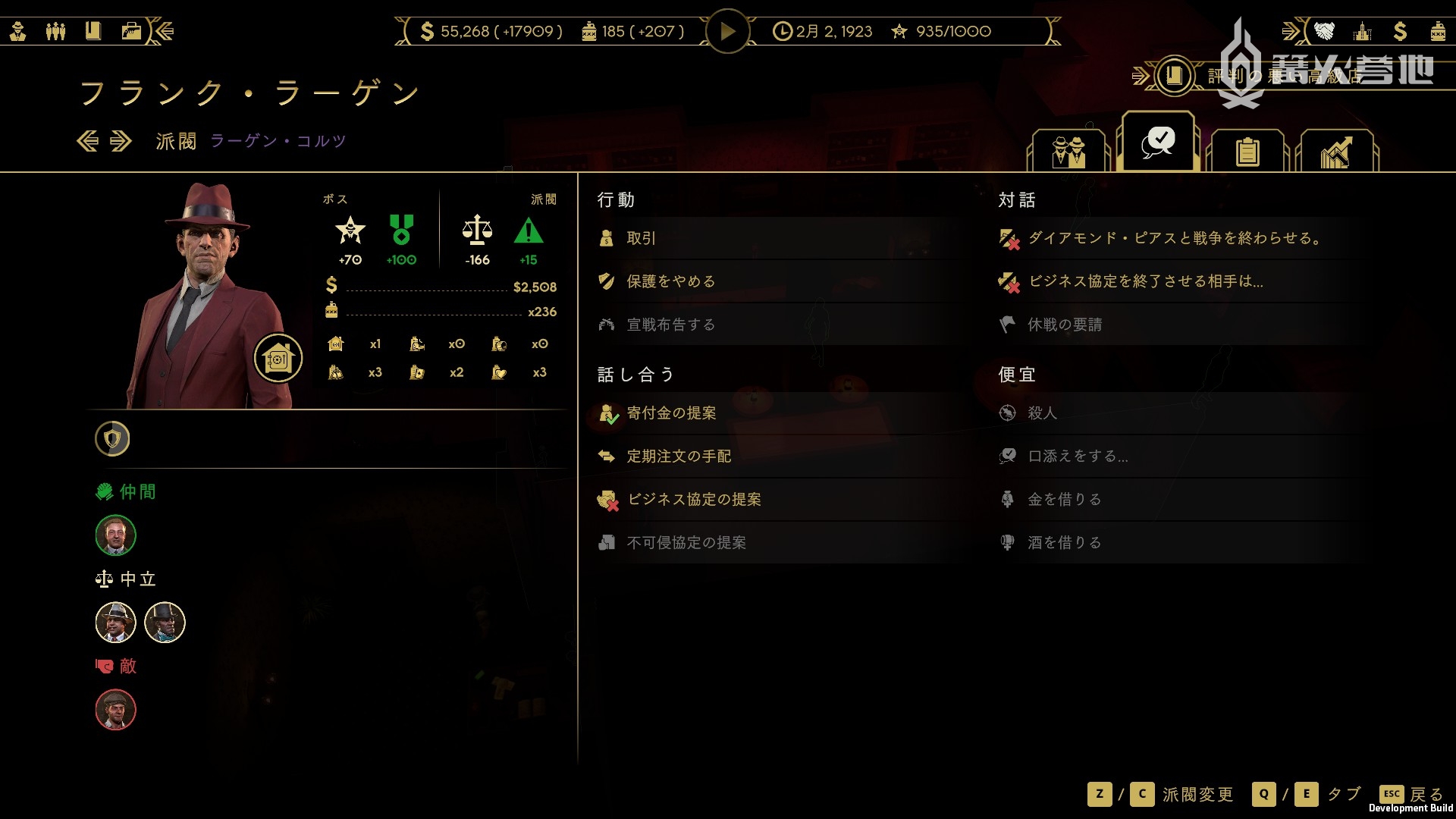 在外交画面中,可以查看与遇到的对手派系的关系、所持店铺数量、现金和目前为止的交往记录。另外,通过外交画面可以进行各种交易的提案或废弃。