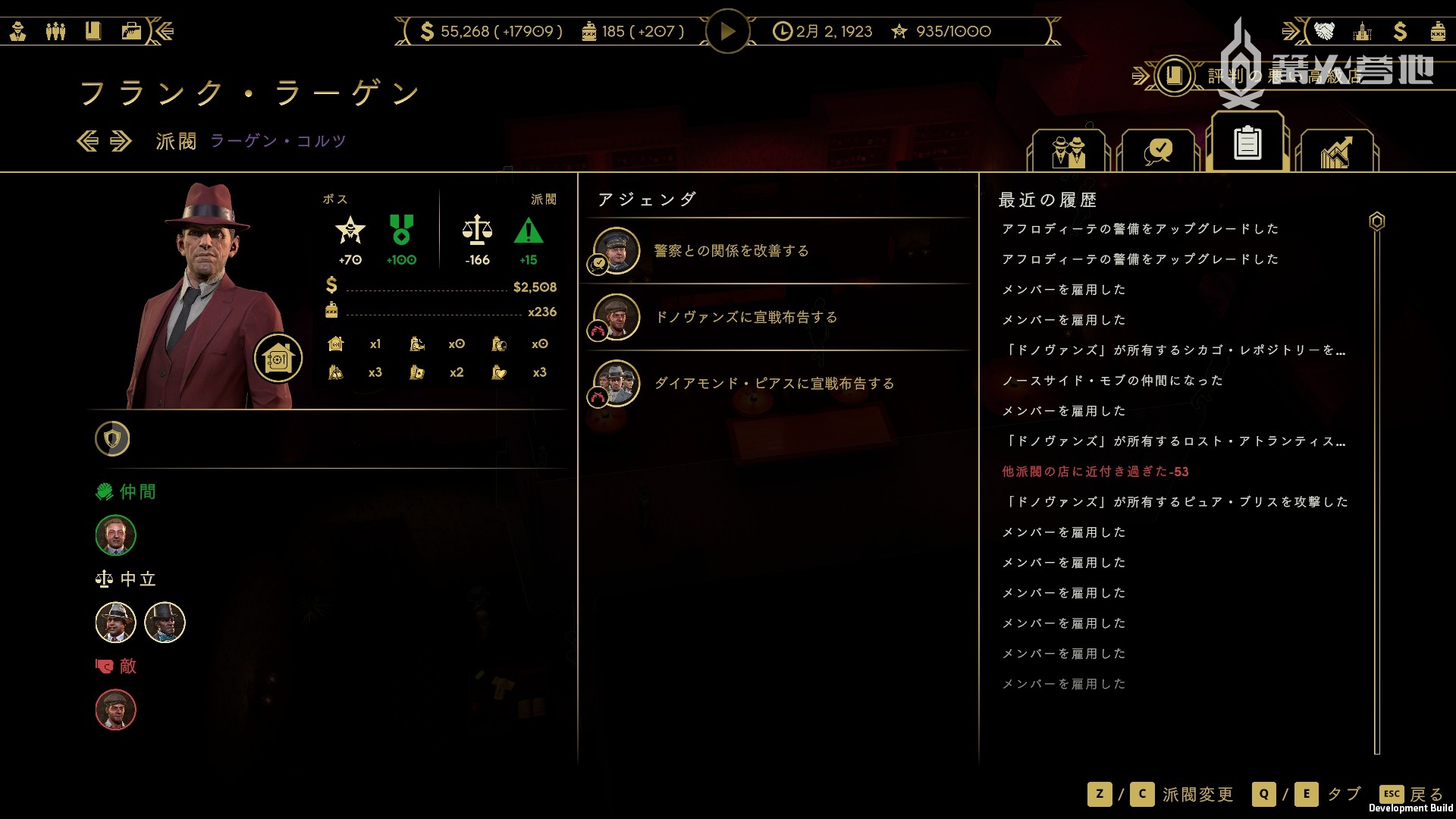 | 威胁 | 表示对手派系将玩家视作多大的危险的数值。受到玩家派系的大小、雇佣的黑帮成员数量、 与玩家持有店铺的距离以及战斗的势头等因素影响。 |