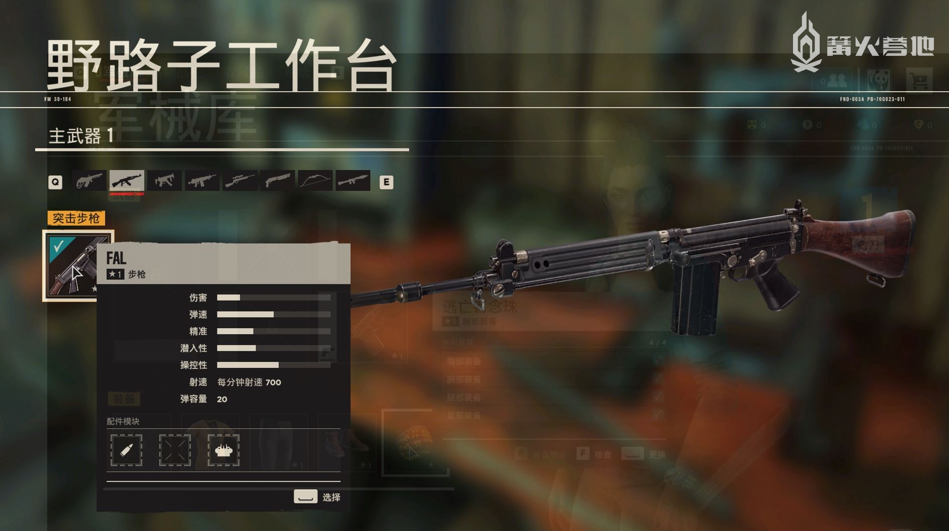 除野路子武器以外,其他 7 种武器又都分为普通版和独特版两个类别,前者自带 3 个或者更多的模块改造栏位,可以在工具台通过消耗特定资源生产配件之后装在武器上。而「独特」类武器的种类虽然和普通武器一样,底子同样为 FAL 步枪、M16 A1、MP40 等等,只不过它们都有特定的名称、外观以及模块组,玩家不能对其进行改造。这些独特武器往往需要通过完成特定任务或是在某些特殊地点搜索而来,就性能而言不一定就强过玩家自己改造的同种枪械,但往往有着十分拉风的迷彩造型,而这些迷彩是可以应用到其他同类型普通枪械上的,这显然会提升玩家搜集这些独特武器的意愿。