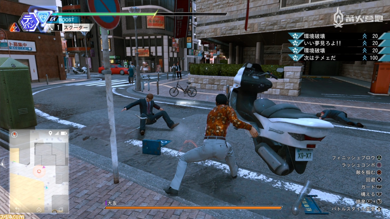 游戏一开场就能够使用的「火拼」是一种相对较为平衡的战斗风格,以《如龙》系列为例的话,可以说比较接近桐生一马的动作风格。该风格下角色能够使用各式各样的武器,并且可以随时进行回避和反击。