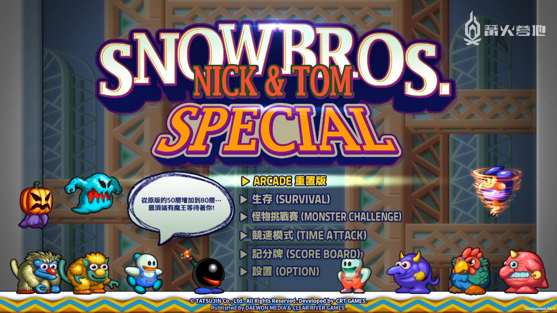 代理商杰仕登宣布,由专门制作怀旧游戏的 CRT Games 开发,DAEWON MEDIA GAME LAB 发行,原预计于 4 月 21 日上市的经典怀旧动作游戏重制版《雪人兄弟 Special》,由于原厂生产延迟,将延期至 5 月 19 日推出。本次也将首度公开中文版游戏画面。