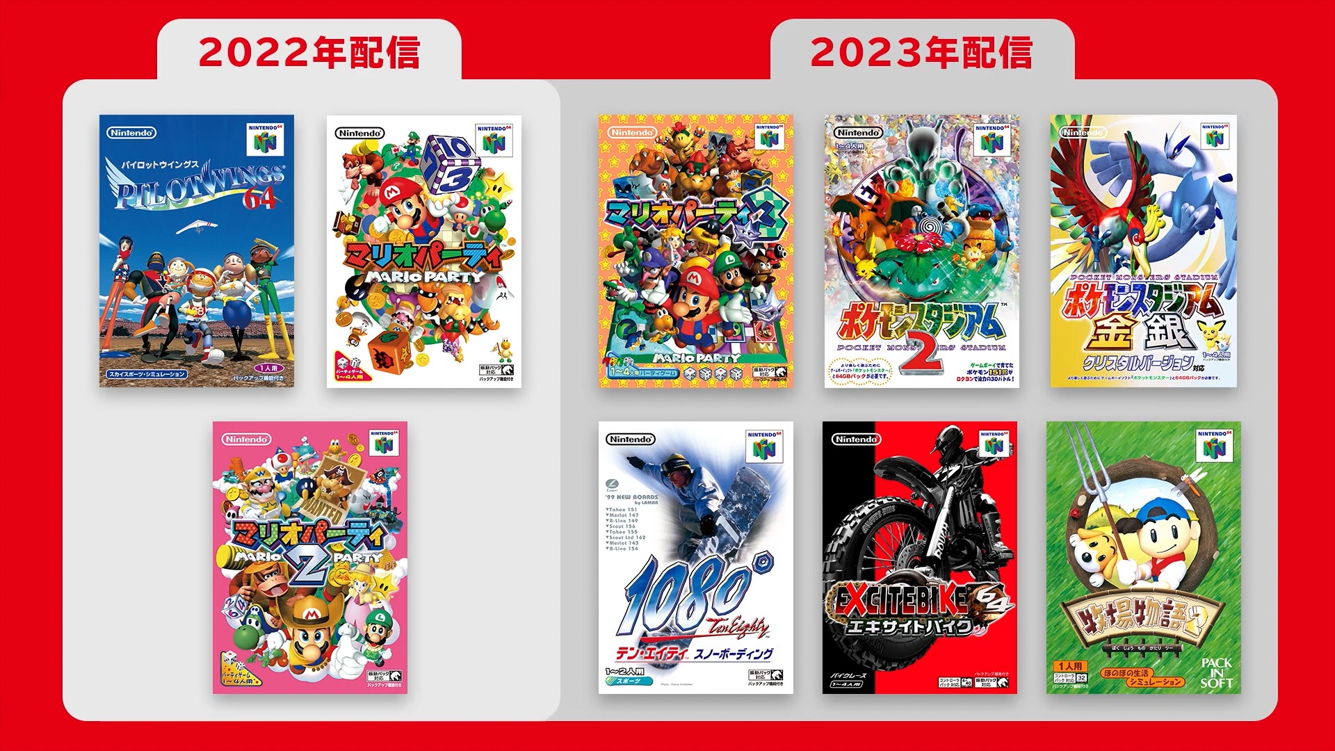 N64 免费游戏库《Pilotwings 64》《马力欧派对 1/2/3》《宝可梦 Stadium 1/2》《1080° Snowboarding》《Excitebike 64》和日区独占的《牧场物语 2》,将陆续在 2022 和 2023 年推出,《007 黄金眼》将于 2023 年推出,支持多人对战。