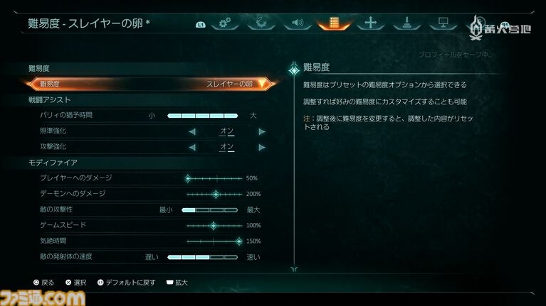 本作提供了从「スレイヤーの卵」到「ナイトメア」多个难度选项,但这些只是预设难度。如果玩家觉得游戏过难或过于简单,可以对细节进行调整。这种调整反映了 id Software 让每种类型的玩家都能享受《毁灭战士》的坚定决心。以下是与难度相关的一些调整选项: