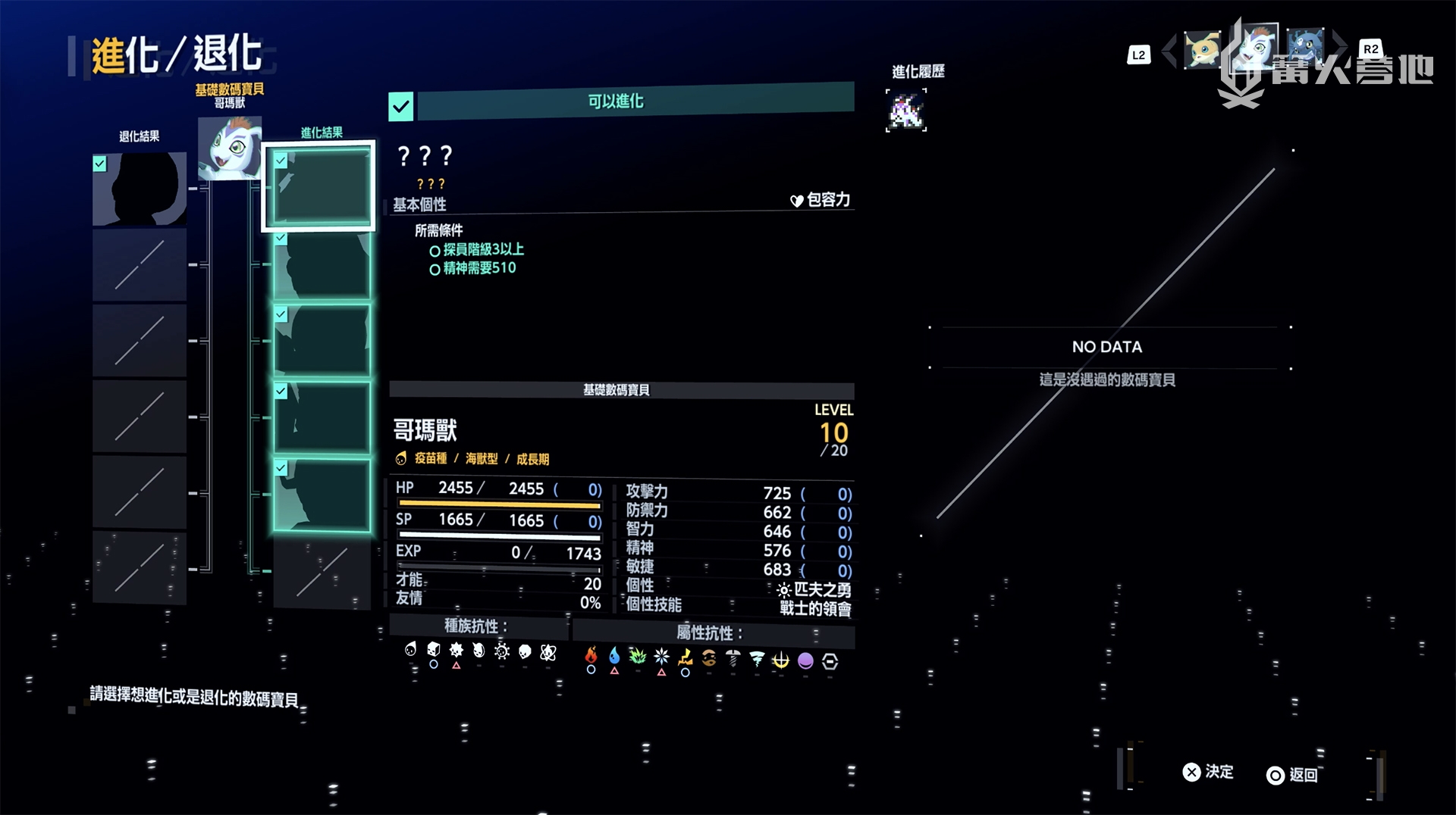 我也体验了本作的重要养成系统:进化。在相关菜单中,玩家可以看见每只数码宝贝对应的进化与退化方向。