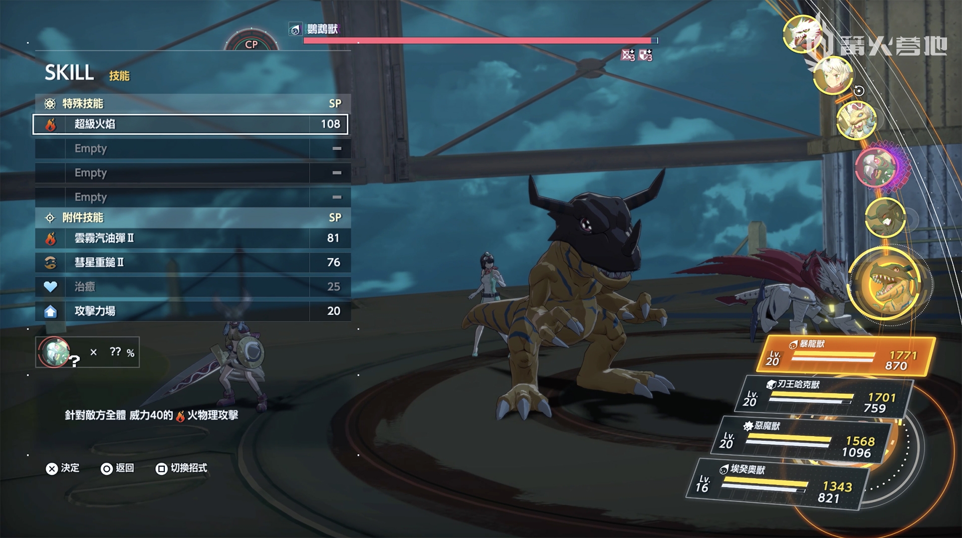 回到鹦鹉兽上。此 Boss 血量很高,如果不能以属性克制的技能攻击之,恐怕会演变成持久战。且它的落雷攻击有概率令数码宝贝陷入麻痹状态,白白浪费出手机会。