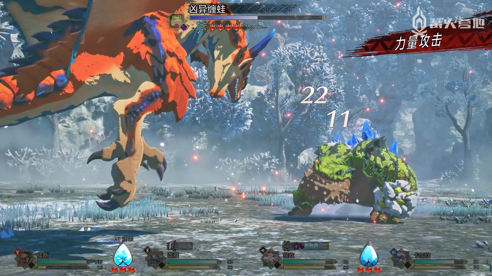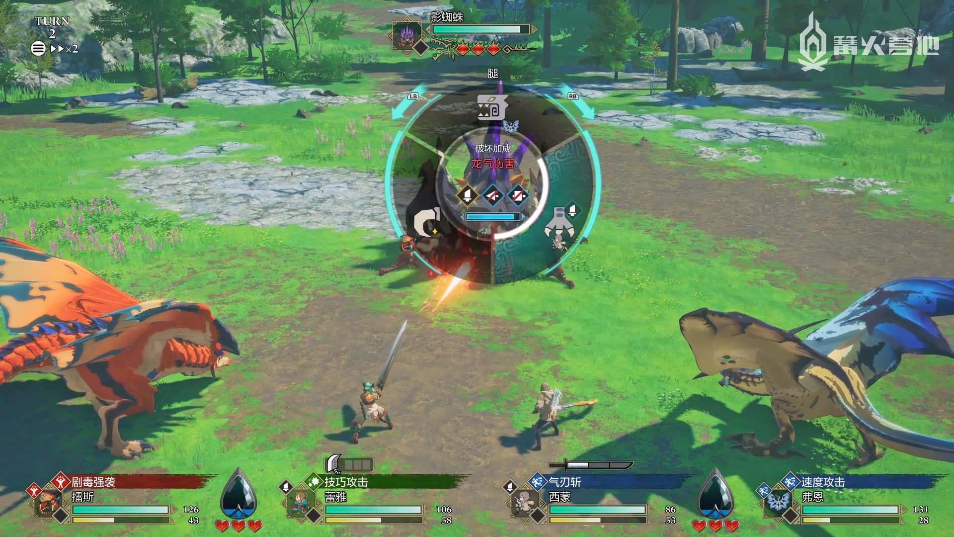 这种策略深度,很大程度上得归功于本作新增的“精力”系统和象征怪物耐力值的“龙气槽”。这两大要素将《怪物猎人》系列原本的动作性巧妙地转化成了回合制指令,为战斗赋予了更丰富的策略维度。